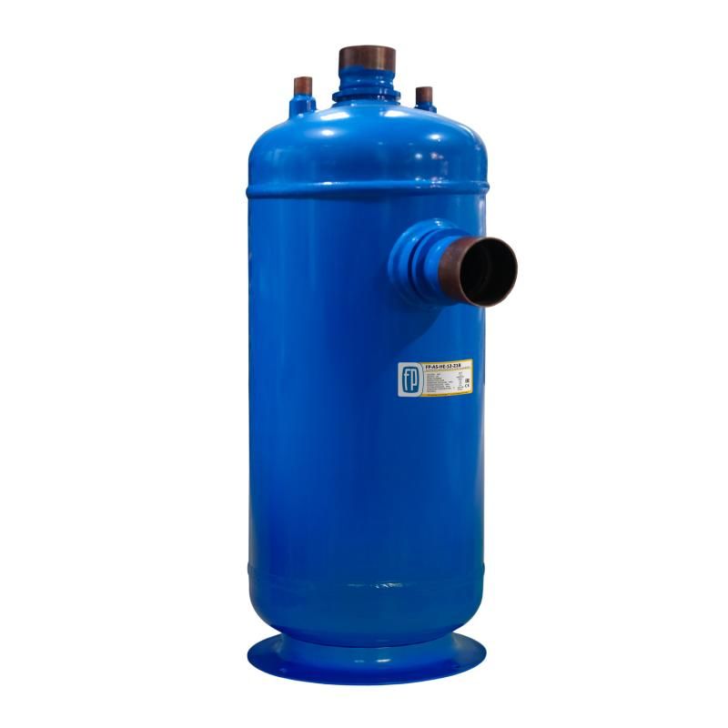 Главная задача отделителя жидкости с теплообменником FP-AS-HE-12 состоит в том, чтобы предотвратить «влажный ход компрессора». Этот узел необходим не только во всех установках с затопленными испарителями, но и в установках, снабженных испарителями с перегревом, для предотвращения накопления хладагента в жидкой фазе на линии всасывания.
